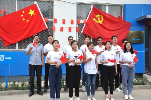 蔚藍(lán)的天空下,闊大的中心湖平臺上,一面鮮艷的黨旗高高聳立。兩名旗手高舉黨旗和國旗,沿著炎黃科技園黨建長廊向平臺飛奔而來。